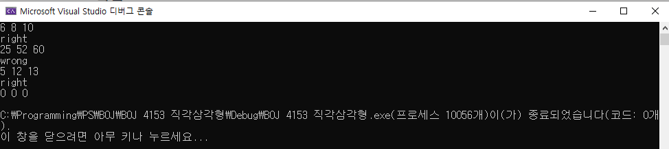 입력은 여러개의 테스트케이스로 주어지며 마지막줄에는 0 0 0이 입력된다. 각 테스트케이스는 모두 30,000보다 작은 양의 정수로 주어지며, 각 입력은 변의 길이를 의미한다.